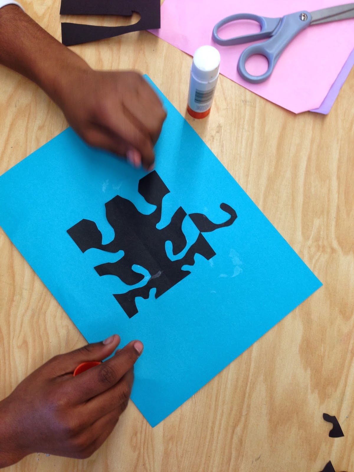 | After the pieces are selected the students arrange them on the background and glue them into place. |
